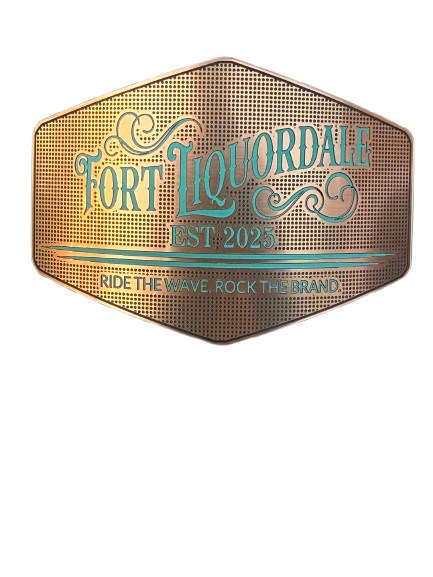 Laser engraved tri layered acrylic hat revealing copper, black, and turquoise colors. Heat applied to a 1010 brand hat.